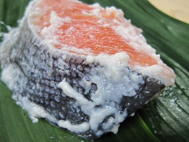 鮭(さけ)は北海道産を厚切りにして粕で脂、旨みを封じ込めております。
