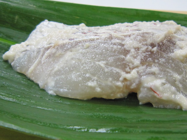 贅沢に 約100g の大きな切り身におろし、当店の伝統製法で練りあげた粕に漬け込みます。